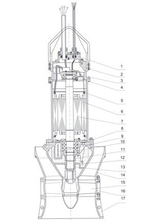 ![]() QZ型潜水轴流泵结构总图 | 1、接线盒盖 2、上端盖 3、渗漏报警器 4、上轴承 5、热保护器 6、定子 7、转子 8、下轴承 9、渗漏报警器 10、下端盖 11、上机械密封 12、电极探头 13、下机械密封 14、导叶体 15、叶轮部件 16、叶轮外壳 17、进口喇叭 |