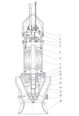 ![]() QH型潜水流泵结构总图 | 1、接线盒盖 2、上端盖 3、渗漏报警器 4、上轴承 5、热保护器 6、定子 7、转子 8、下轴承 9、渗漏报警器 10、下端盖 11、上机械密封 12、电极探头 13、下机械密封 14、导叶体 15、叶轮部件 16、进口喇叭 |