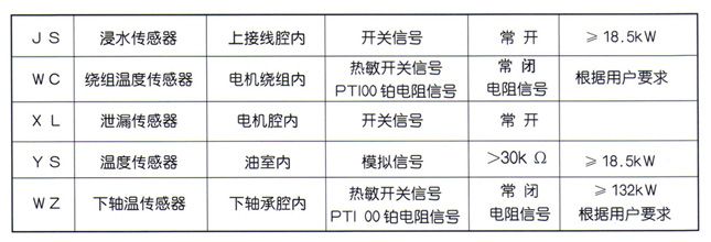 潜水电机是全密封干式异步电动机,机壳将电机封闭,电机上端电缆出线处有静密封装车,电机下端盖出轴处有转动密封装置,潜水电机具有一切运行的安全可靠性能。对密封渗漏、线圈和轴承温升均有监测、报警和保护装置,不影响电机正常运转的早期渗漏(只报警)。当线圈温度超过135℃、轴承温度超过90℃时,采用断电保护,所有保护器由一个潜水泵专用保护器进行监控,以保证潜水泵的安全使用。