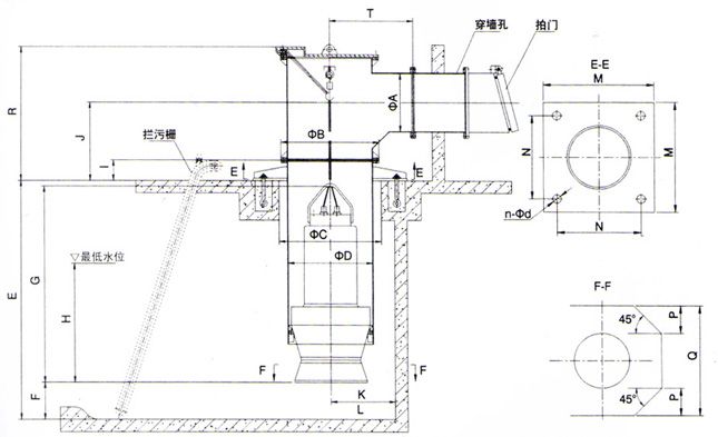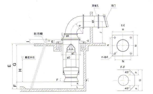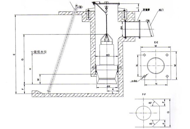 较小的QZ系列潜水轴流泵、QH系列潜水混流泵用开关敞式进水,安装形式为井筒弯管式安装、钢制井筒式安装、混凝土预制井筒式安装。井筒弯管式安装、钢制井筒式安装由本公司提供整套井筒,混凝土预制井筒式安装由本公司提供安装底座(含防转装置)、井盖。