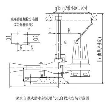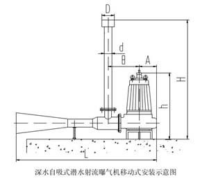 潜水射流曝气机需本公司协助选型时,用户应提供池型、介质特性、所需进气量、潜水深度等相关数据,以便本公司设计和提供优质设备,更好地满足用户的需求。安装形式有自耦式和移动式两种。自耦式安装是将曝气装置和专用的底座固定在水池底部,在池顶安装好配套的支撑块,用导轨使两者相连,潜水电泵与特定支架联接好后沿导轨下滑到底座出口位置,通过泵自重,自动耦合并密封。自耦式安装无需安装或维修人员进入水坑即可提升和安装电泵。移动式安装方式是将深水自吸式潜水射流曝气机安装于池底部,依靠自重定位,具有安装位置可变动、灵活、成本低等特点。