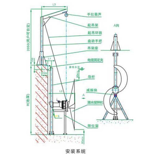客户定货时,请提供池深及池型图,以便厂方加工时确定导杆或导向钢丝的尺寸。安装系统的材质采用不锈钢(或碳钢)制造。安装系统中除导杆或导向钢丝、起吊底座外,多台QJB推进器可共用一套起吊装置(用户有特殊要求除外)。