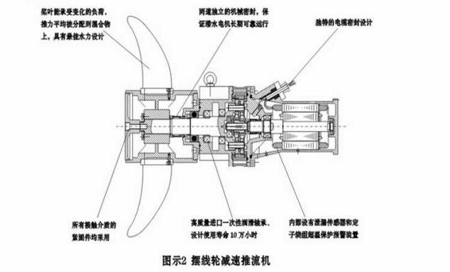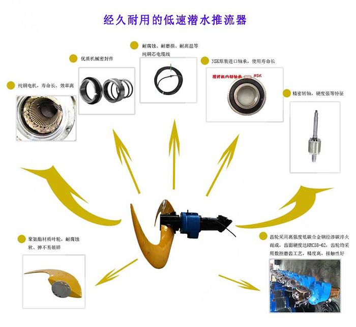 2、我公司研制的潜水推流器,采用硬齿面齿轮减速机传动,摆脱了之前用摆线减速机传动引起的噪音大,晃动剧烈的缺陷。同时,我公司积极研发和改进了机头的形式,使其重量更轻,对减速机影响最小。